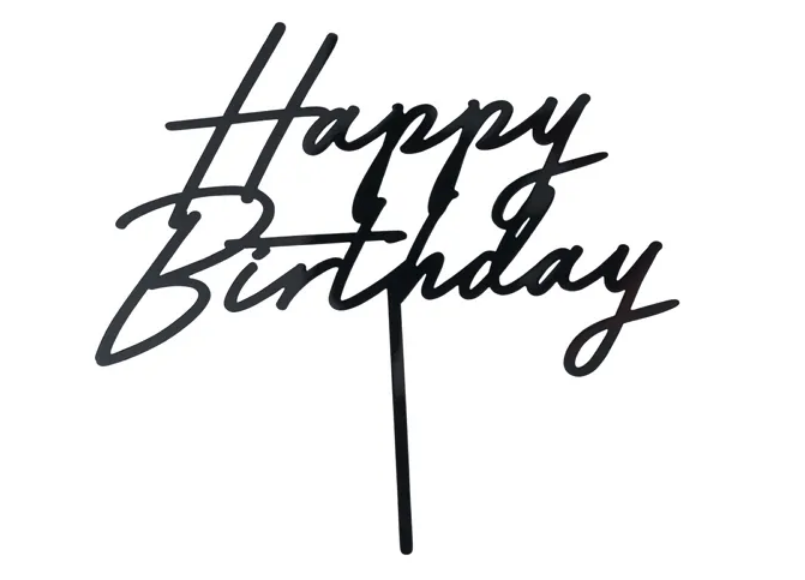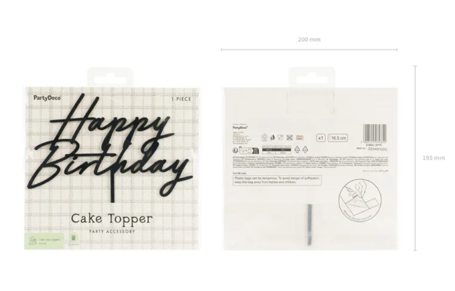 Ozdoba na dort ve tvaru nápisu Happy birthday v černé barvě, výška ozdoby je asi 16.5cm.