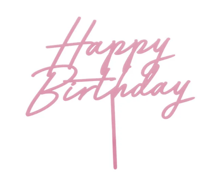 Ozdoba na dort ve tvaru nápisu Happy birthday v růžové barvě, výška ozdoby je asi 16.5cm.