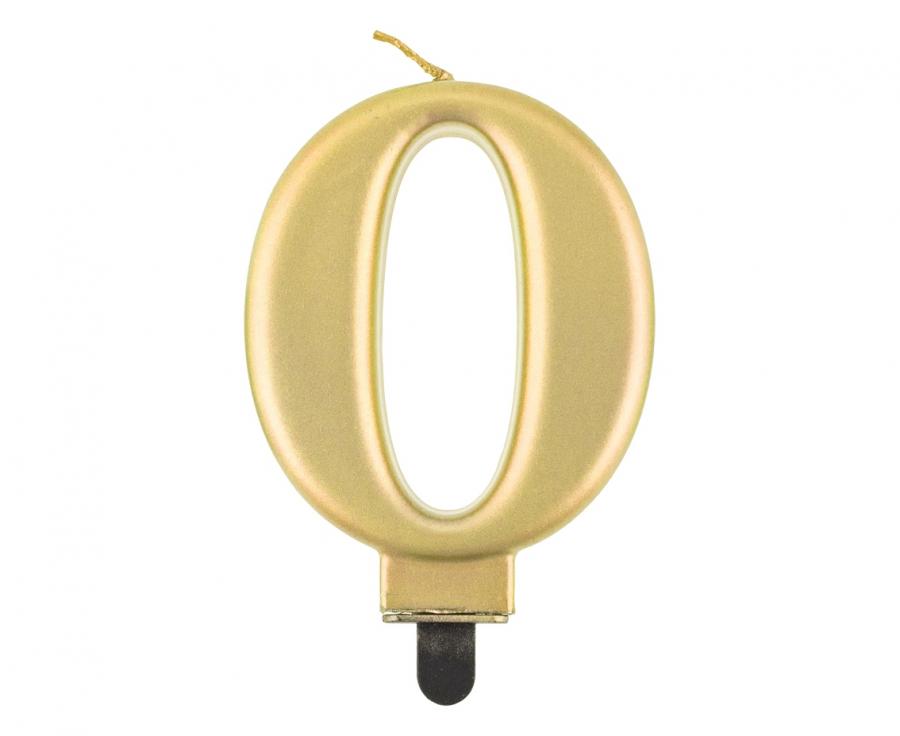 Svíčka ve tvaru číslice 0 ve zlaté metalické barvě.