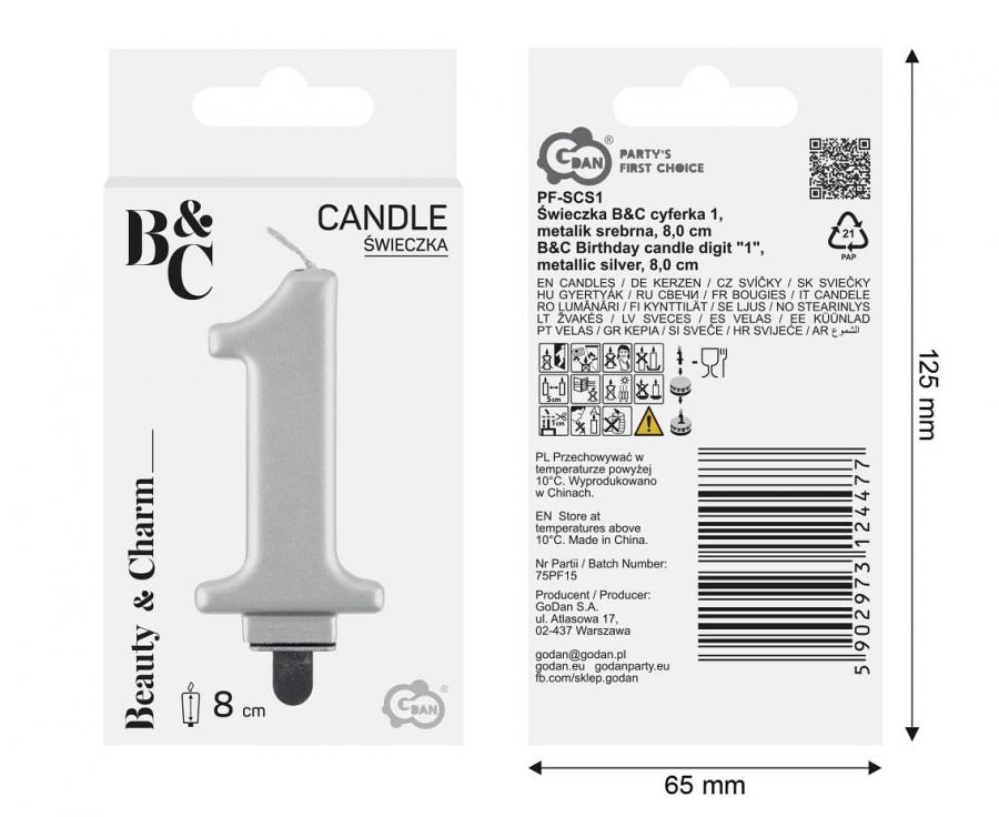 Svíčka ve tvaru číslice ve stříbrné barvě o velikosti 8cm.