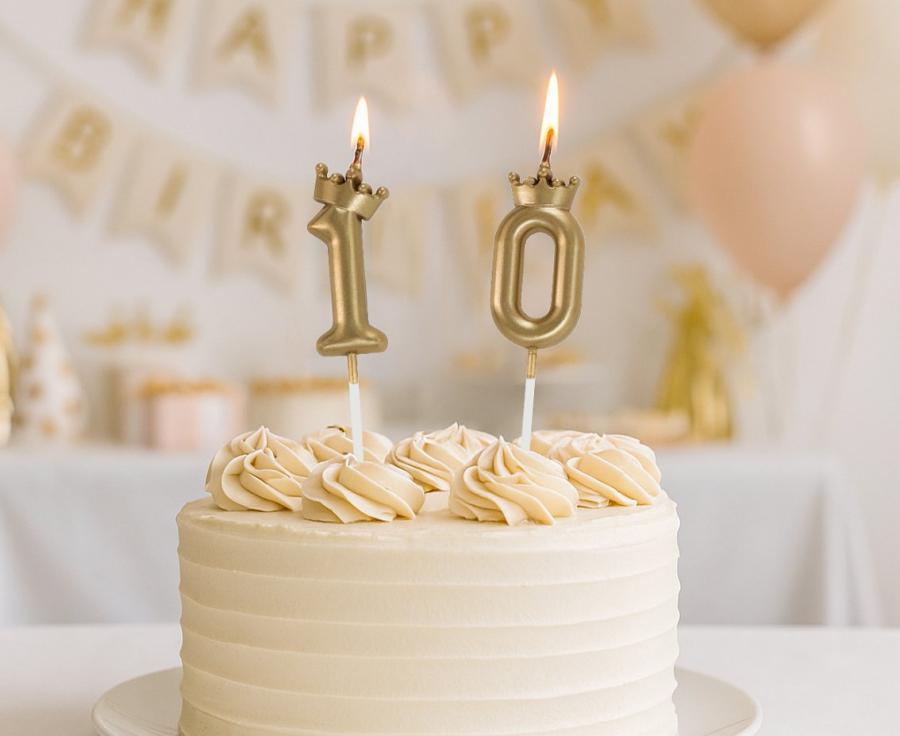 Svíčka ve tvaru číslice 1, zdobená korunkou ve zlaté barvě.