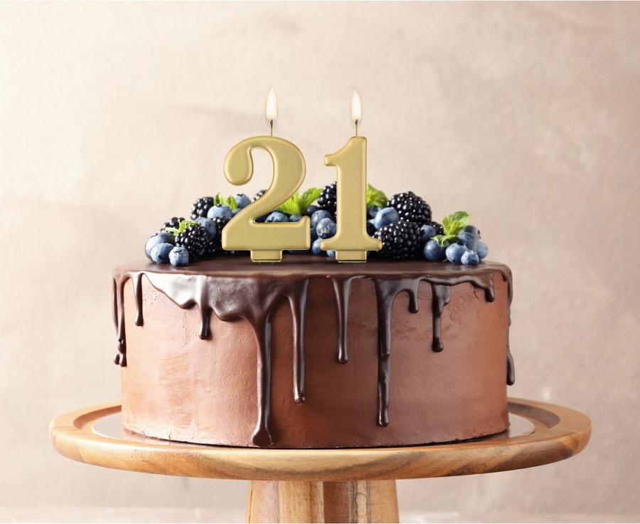 Svíčka ve tvaru číslice 2 ve zlaté metalické barvě.