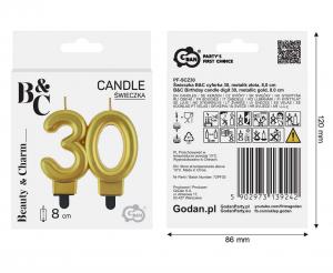 Svíčka ve tvaru čísla 30 ve zlaté metalické barvě.