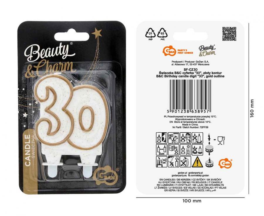 Svíčka ve tvaru číslice 30 v bílé barvě se zlatými okraji a třpytkami.