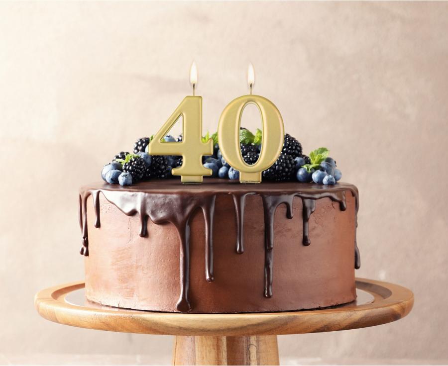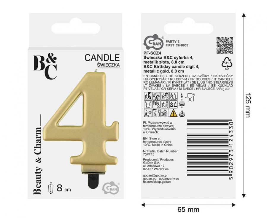 Svíčka ve tvaru číslice 4 ve zlaté metalické barvě.