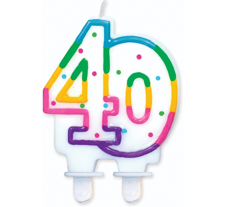 Svíčka ve tvaru číslice 40, zdobená barevnými puntíky.