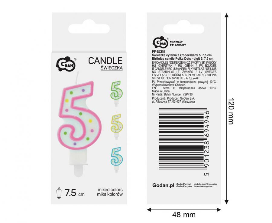 Svíčka ve tvaru číslice 5, zdobená barevnými puntíky dostupná ve čtyřech barvách - žlutá, růžová, modrá a zelená.
