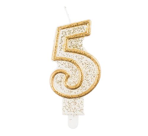 Svíčka ve tvaru číslice 5 ve zlaté barvě se zlatými třpytkami.