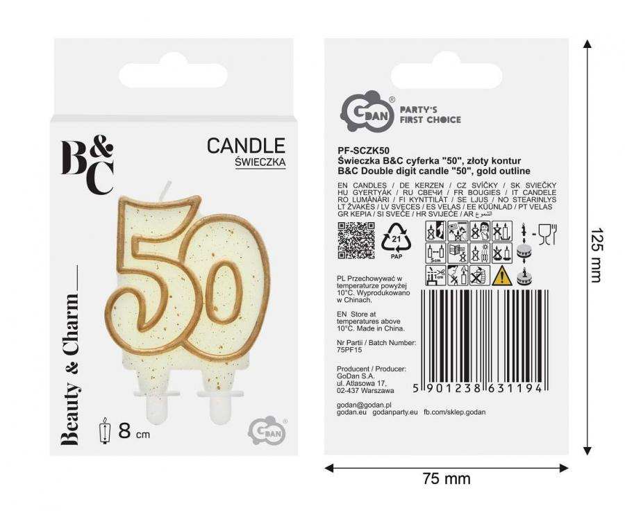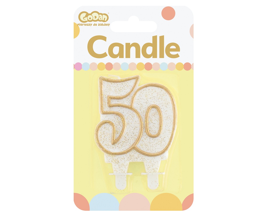 Svíčka ve tvaru číslice 50 ve zlaté barvě se zlatými třpytkami.