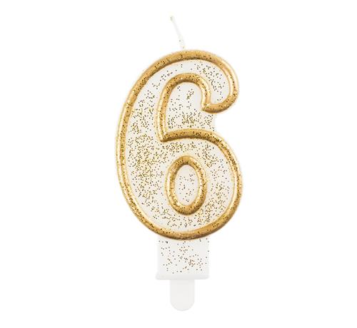 Svíčka ve tvaru číslice 6 ve zlaté barvě se zlatými třpytkami.