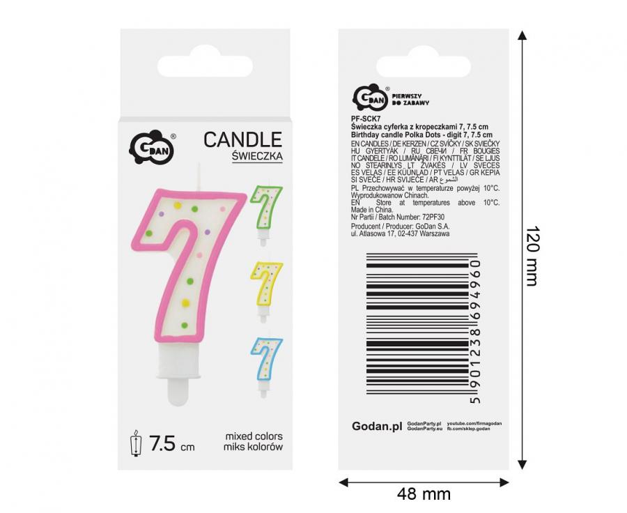 Svíčka ve tvaru číslice 7, zdobená barevnými puntíky dostupná ve čtyřech barvách - žlutá, růžová, modrá a zelená.