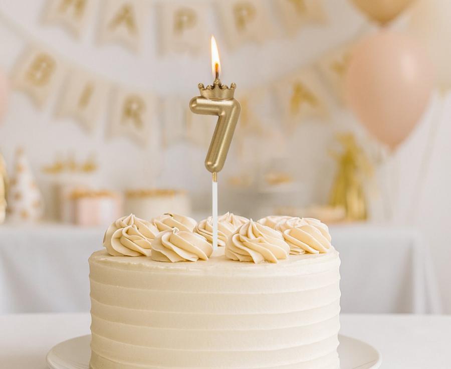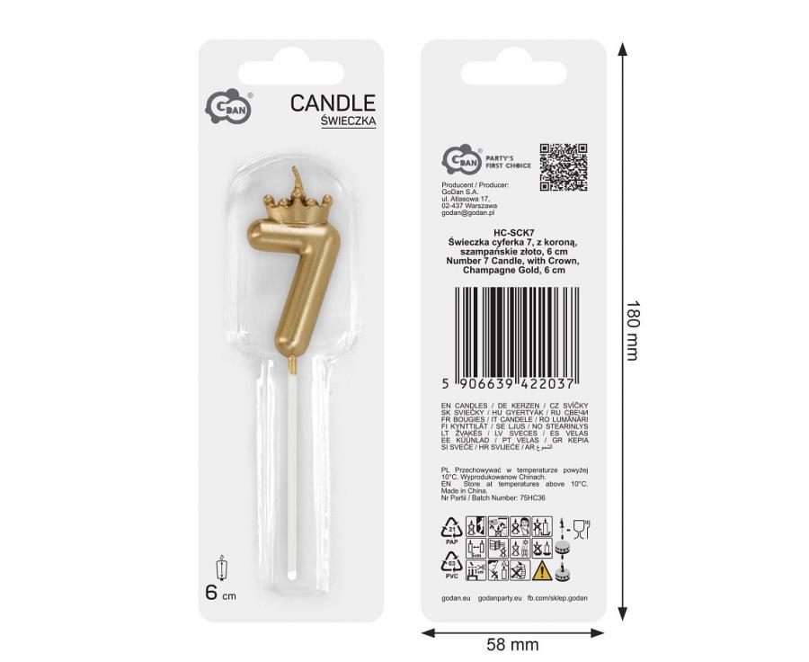 Svíčka ve tvaru číslice 7, zdobená korunkou ve zlaté barvě.