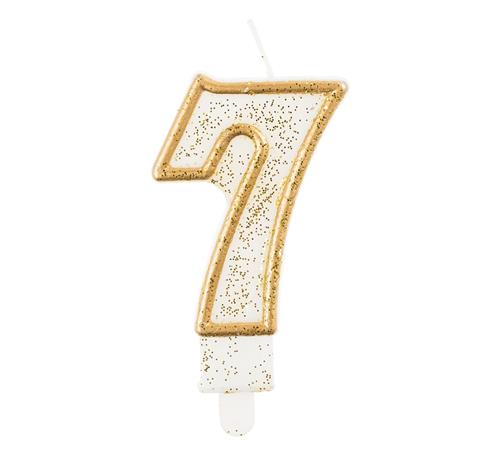 Svíčka ve tvaru číslice 7 ve zlaté barvě se zlatými třpytkami.
