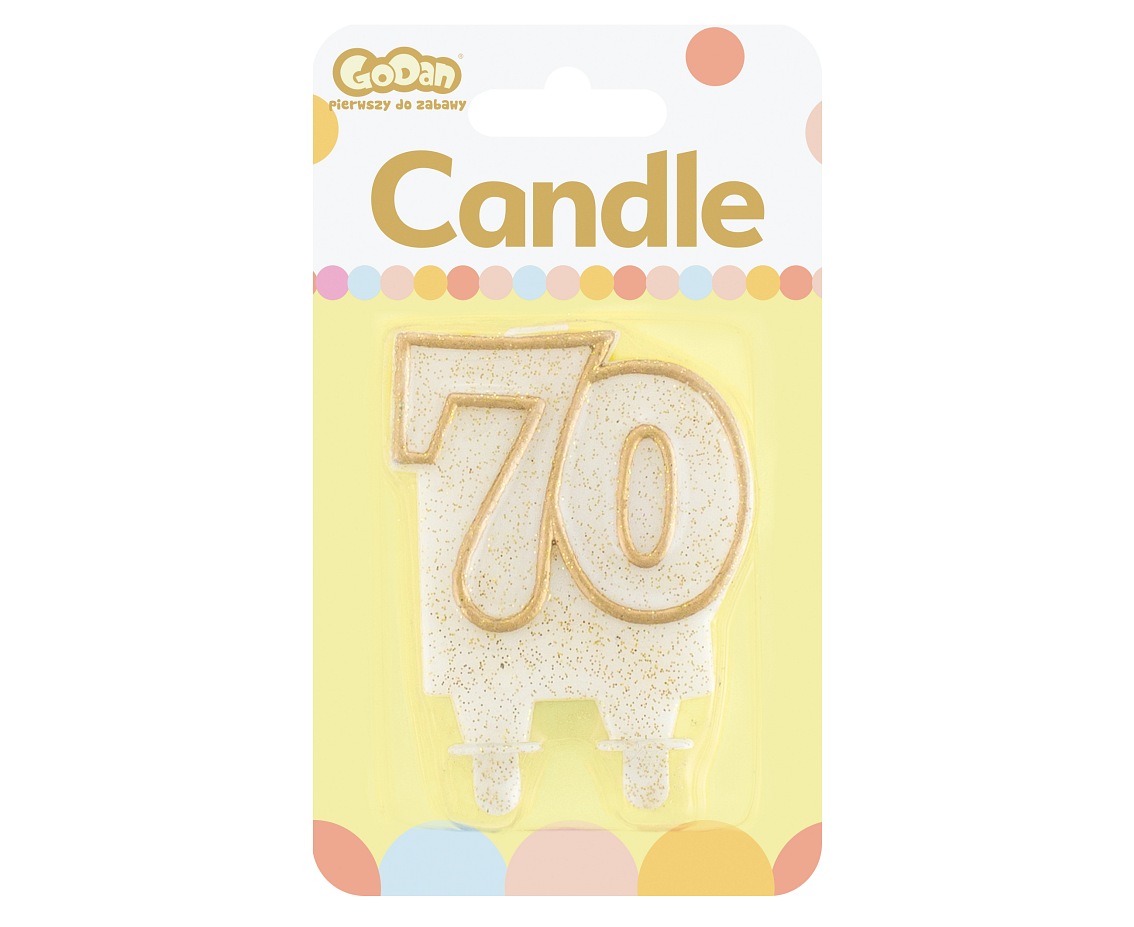 Svíčka ve tvaru číslice 70 ve zlaté barvě se zlatými třpytkami.