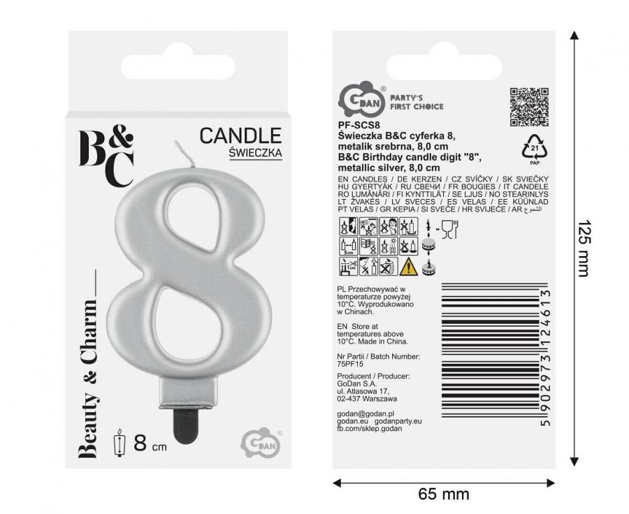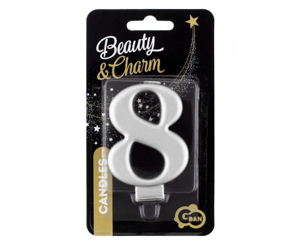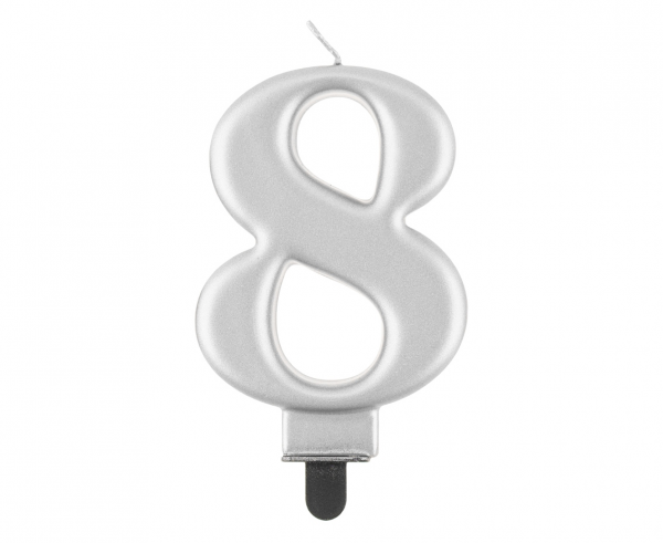 Svíčka ve tvaru číslice ve stříbrné barvě o velikosti 8cm.