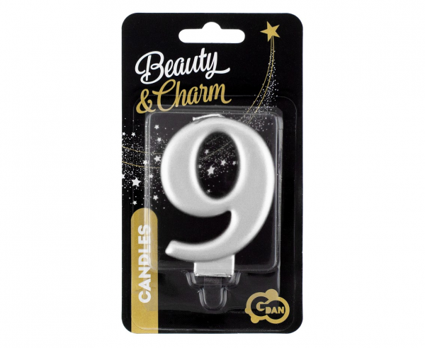 Svíčka dortová číslo 9 stříbrná  8cm - 9a.png