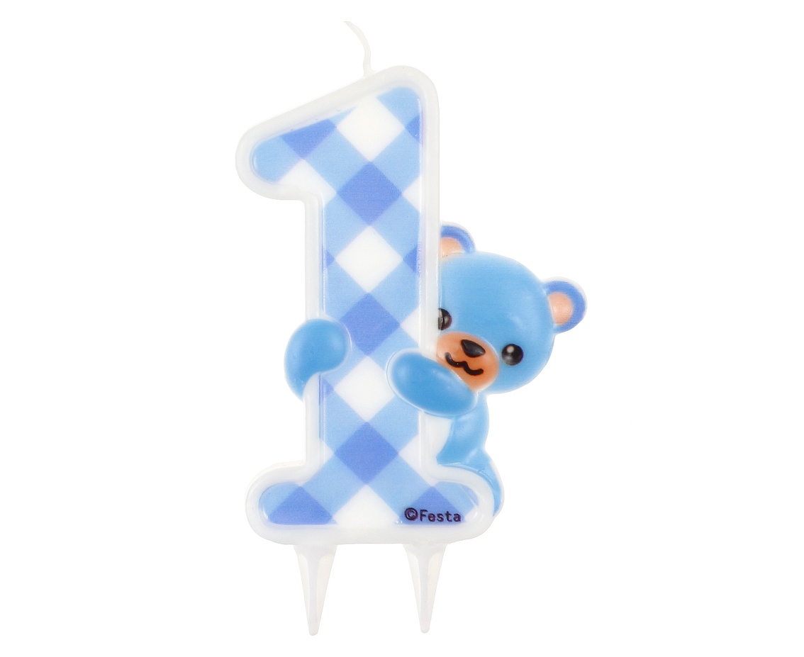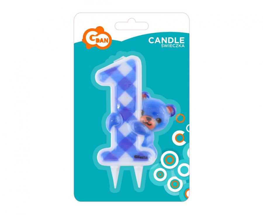 Svíčka ve tvaru číslice 1 v modré barvě s medvídkem.