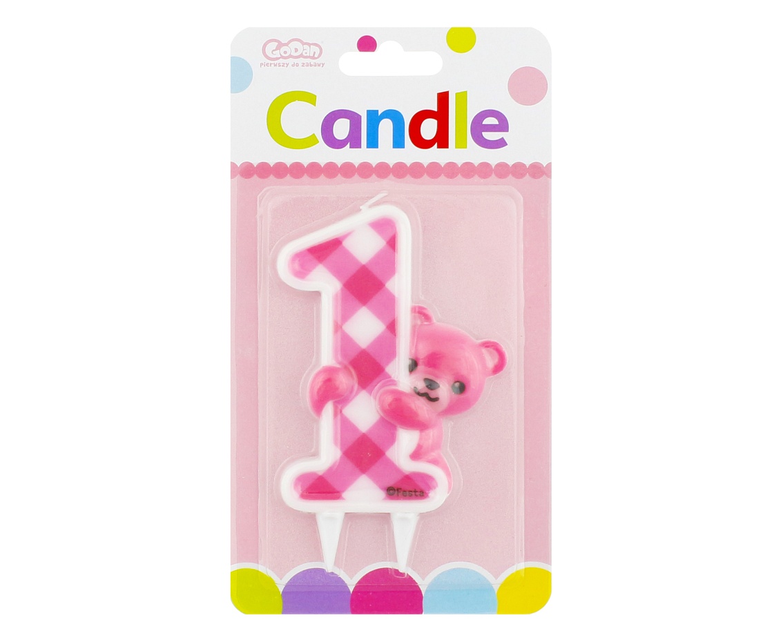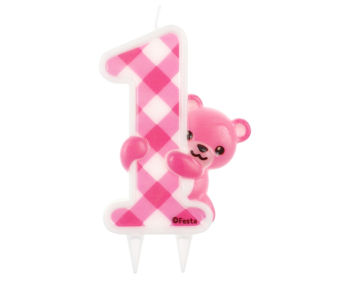 Svíčka ve tvaru číslice 1 v růžové barvě s medvídkem.