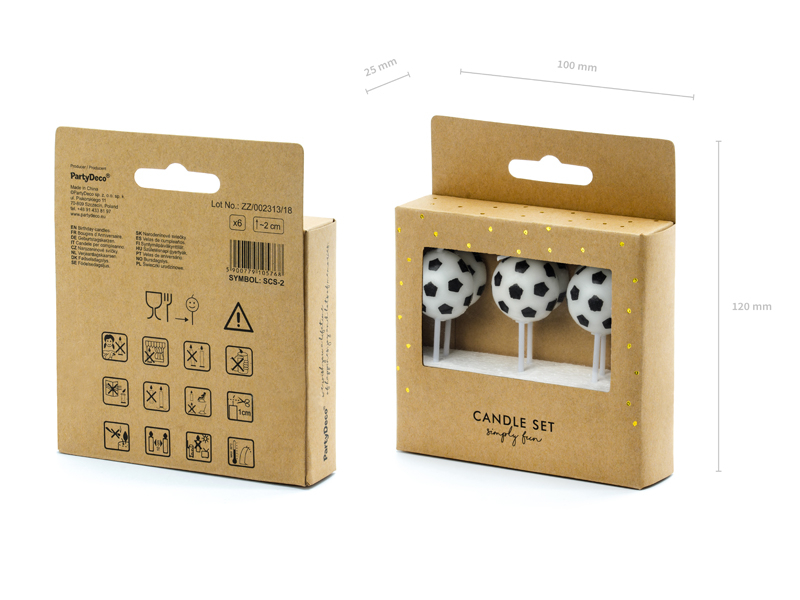 Narozeninové svíčky ve tvaru fotbalového míče v černobílé barvě.