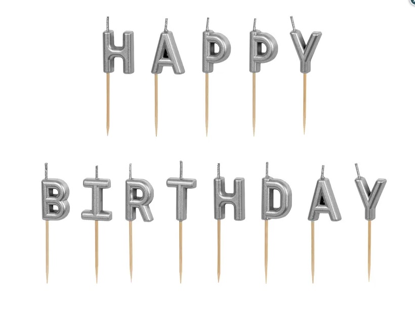 Narozeninové svíčky ve tvaru písmen ve stříbrné.