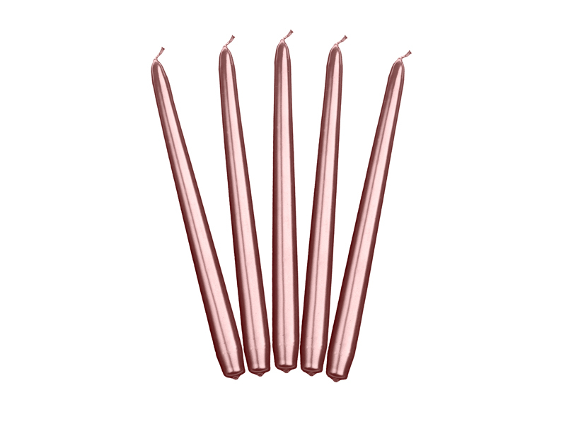 Dlouhá úzká svíčka metalická v rose gold barvě, délka je 24cm.