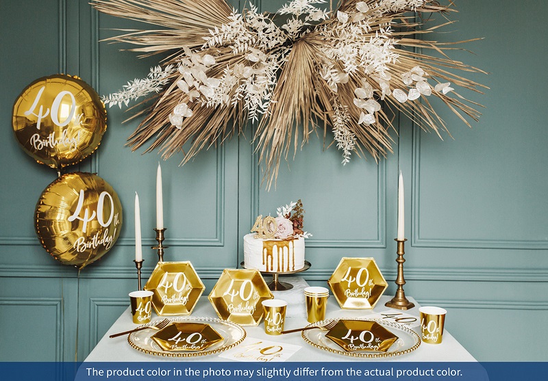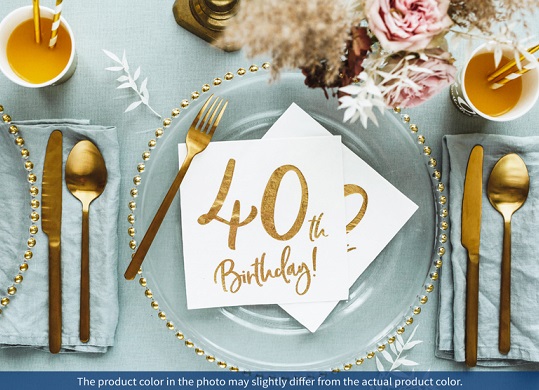 Papírové ubrousky v bílé barvě se zlatým metalickým nápisem 40th birthday (40té narozeniny).