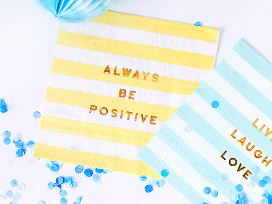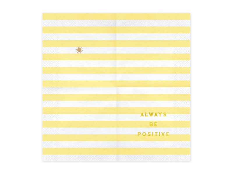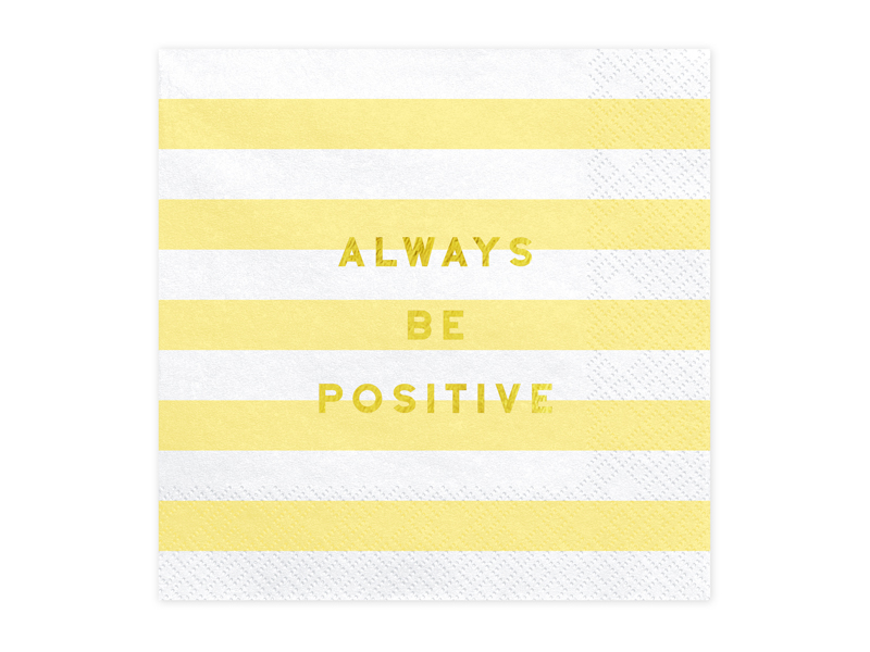 Papírové ubrousky Yummy, bíložluté proužky se zlatým nápisem Always be positive.