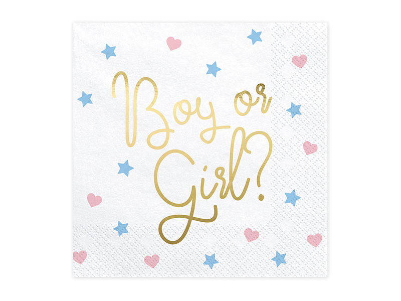 Papírové ubrousky v bílé barvě se zlatým metalickým nápisem Boy or Gilr? a s barevnými hvězdičkami a srdíčky.