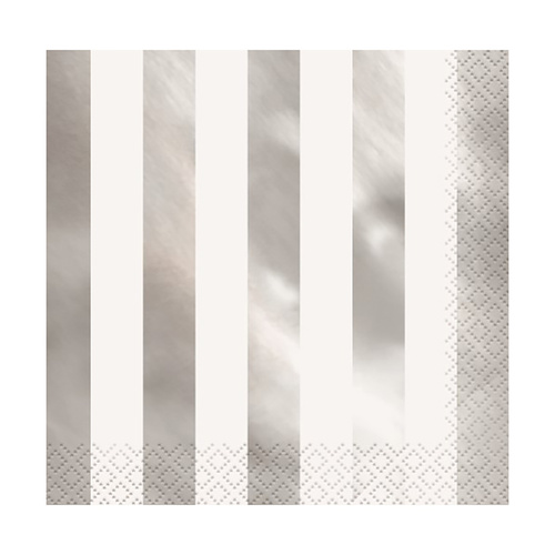 Papírové ubrousky pruhované v kombinaci bílé a stříbrné, vyrobeny z kvalitního dvouvrstvého papíru.