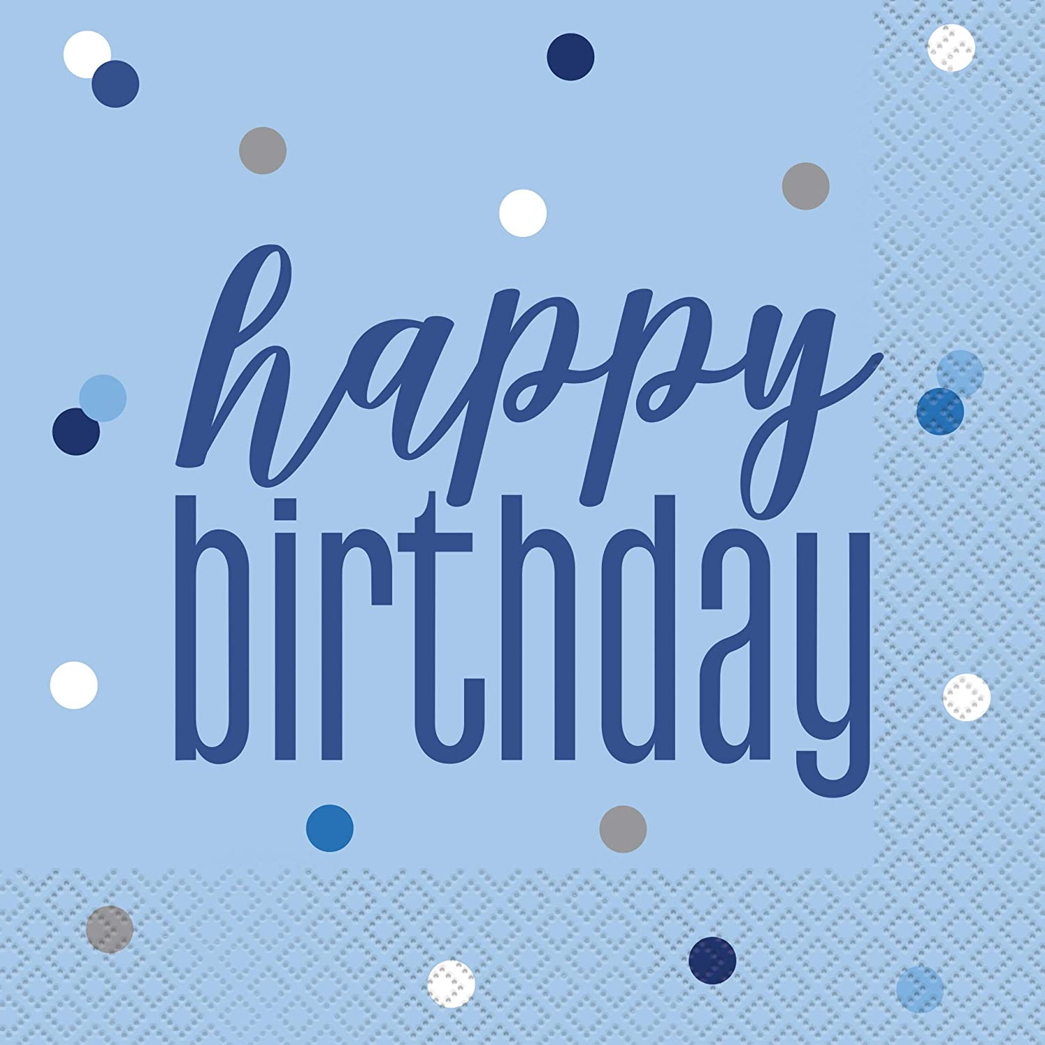 Papírové ubrousky v modré barvě s nápisem Happy birthday a s tečkami.