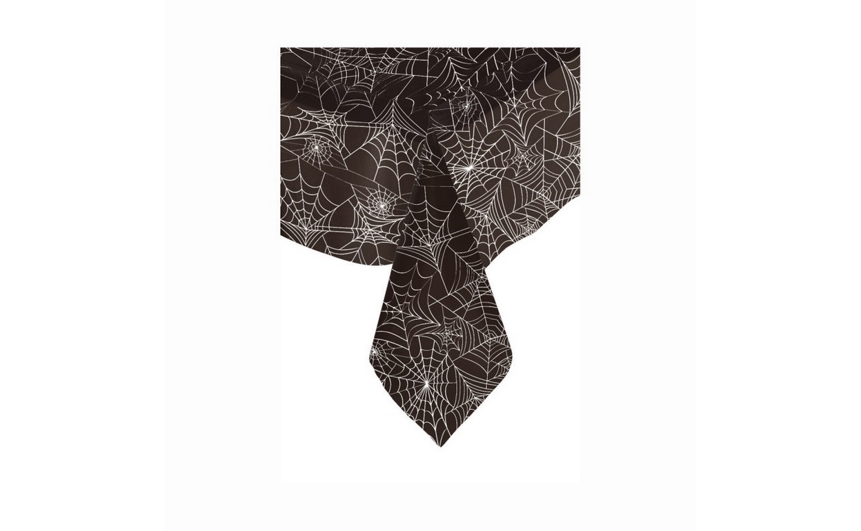 Plastový ubrus v černé barvě s potiskem pavučiny o rozměrech 137x213cm.