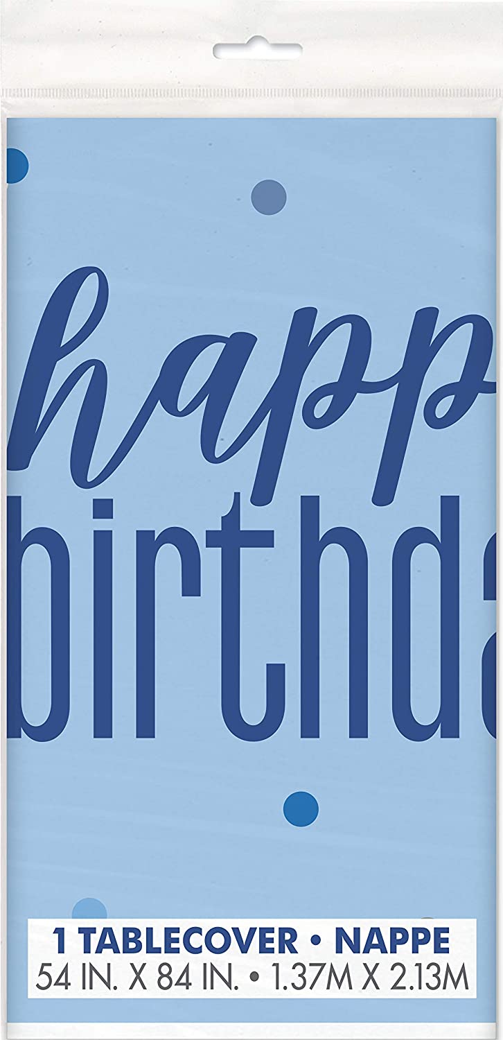 Foliový ubrus v modré barvě s nápisem Happy birthday a modrými puntíky o rozměrech 137x213cm.