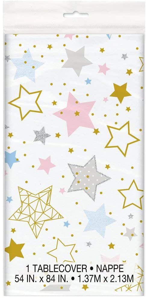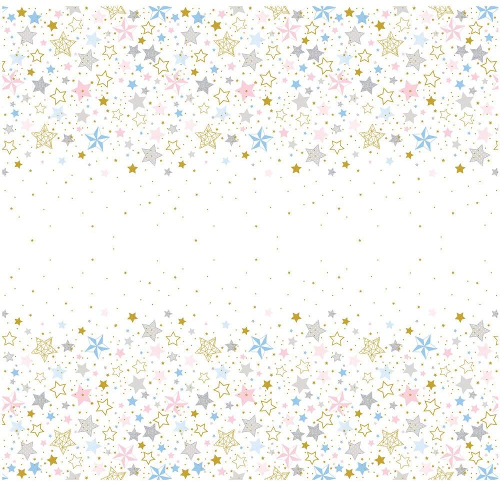 Foliový ubrus v bílé barvě s potiskem barevných hvězd o rozměrech 137x213cm.