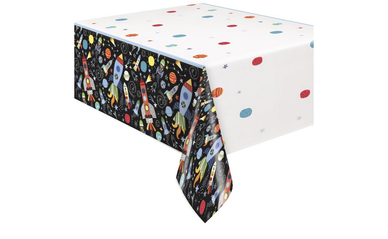 Foliový ubrus s motivem vesmíru o rozměrech 137x213cm.