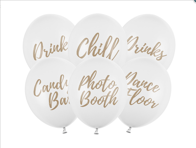 Latexové balónky v bílé barvě s oboustraným potiskem. Každý balónek má jiný potisk: Candy Bar, Chill, Dance Floor, Drinks, Photo Booth
