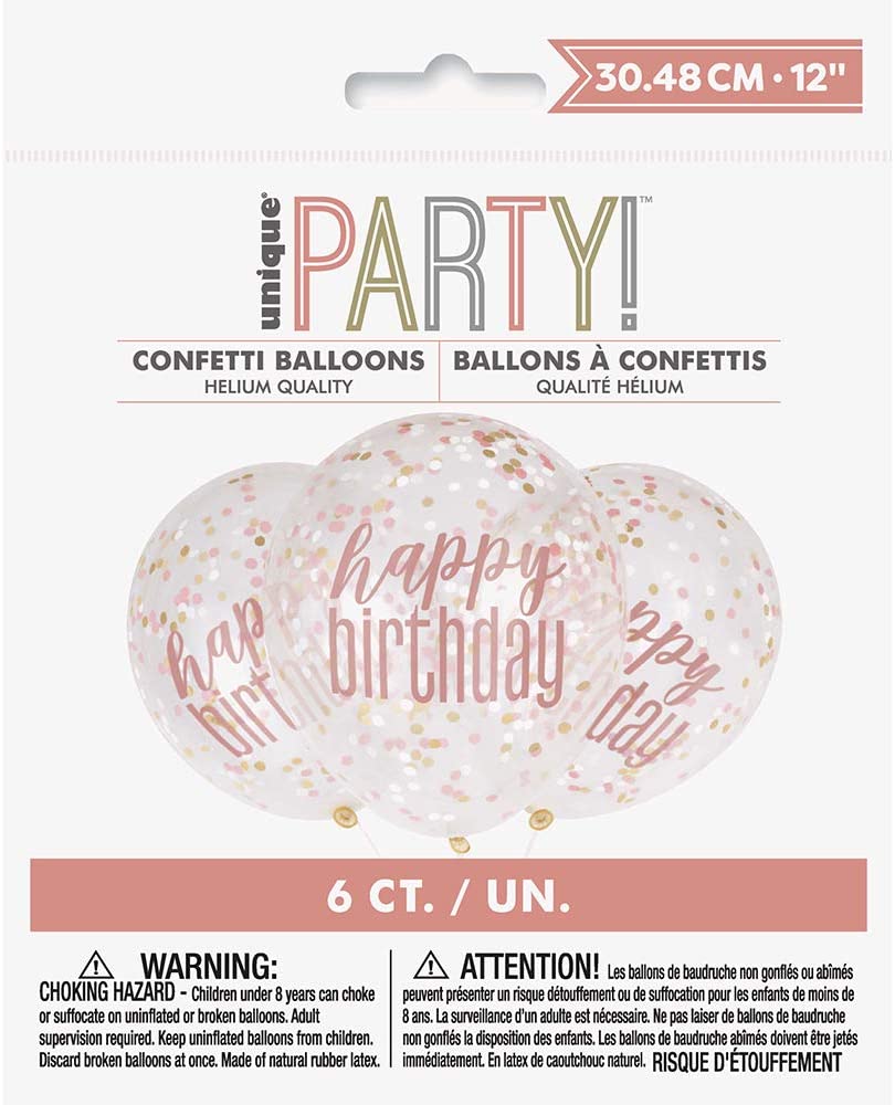 Latexové balónky průhledné s rosegold potiskem Happy birthday a s růžovostříbrnými konfetami.