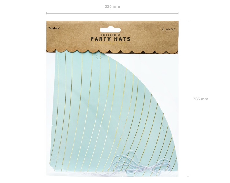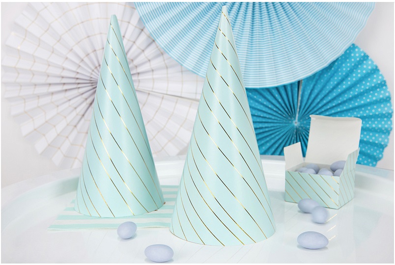 Balení šesti papírových párty čepiček ve světle modré barvě se zlatými proužky.