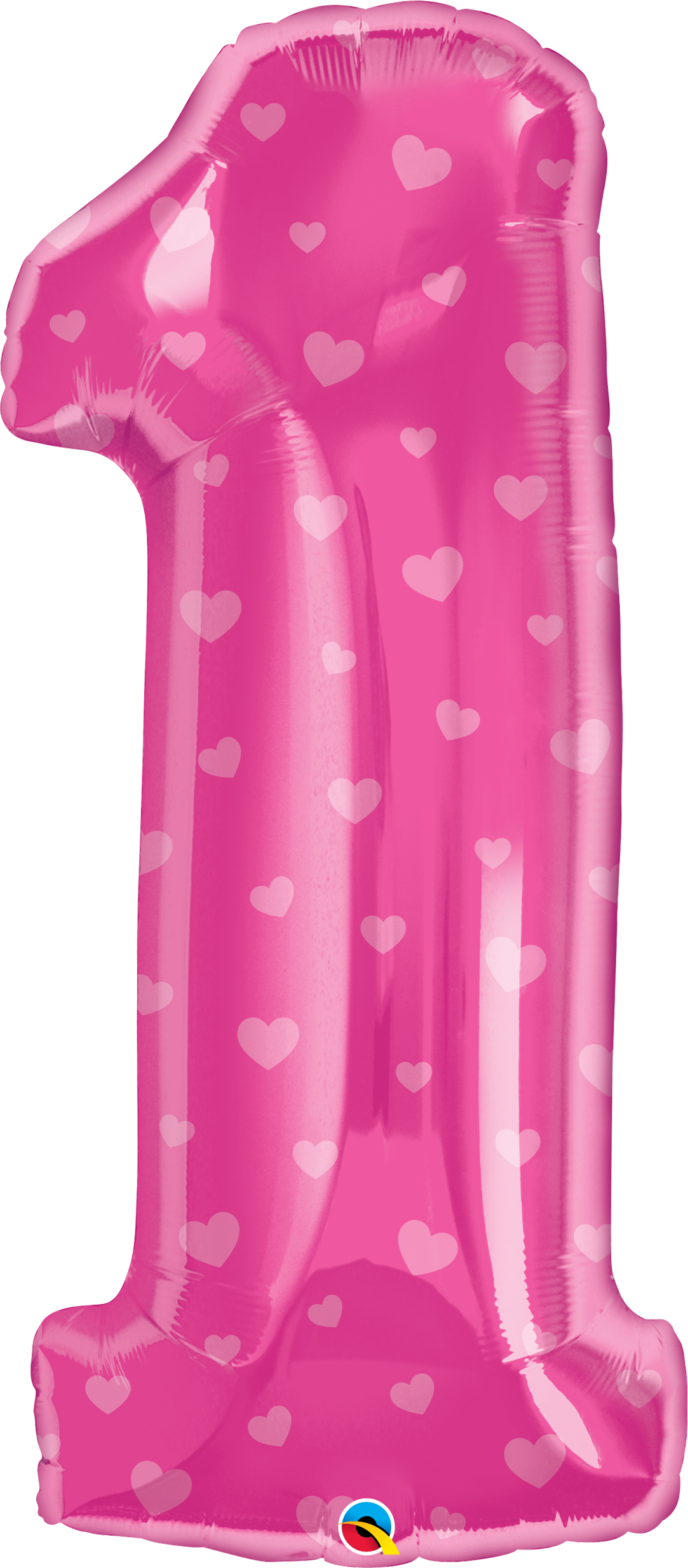 Fóliový balónek číslice 1 v růžové barvě se srdíčky je velký 96cm a je vhodným doplňkem výroční, novoroční i narozeninové výzdoby.