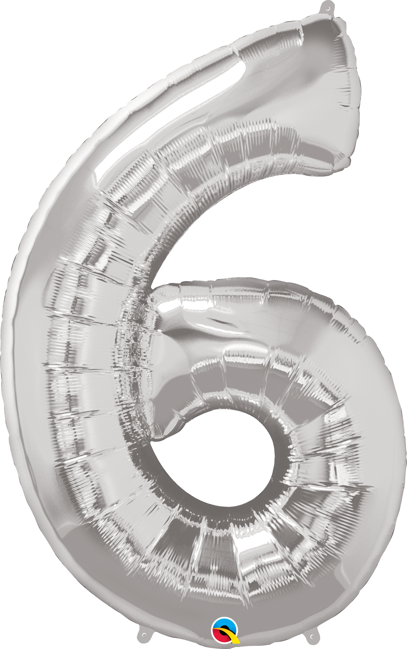 Stříbrná číslice ve tvaru 6, výška 86cm. Vhodné pro nafukování heliem i vzduchem.