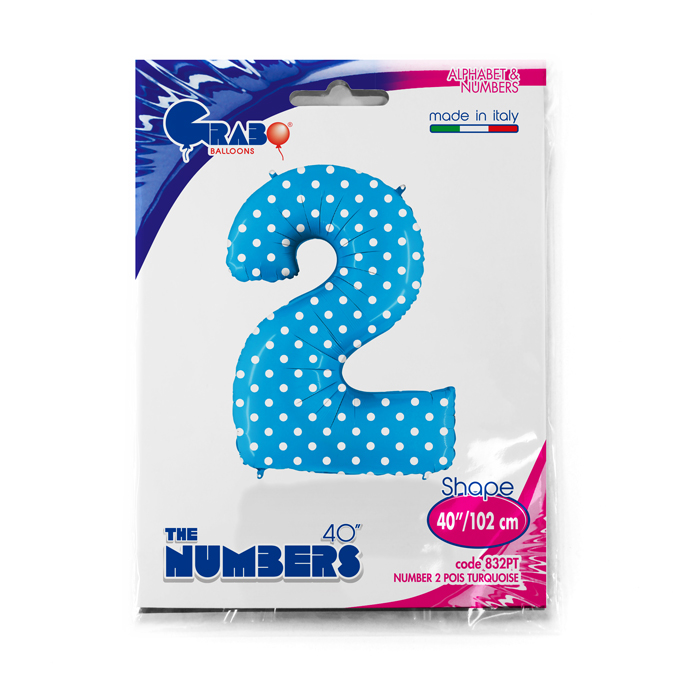 Fóliový balónek číslice 2 v tyrkysové barvě s puntíky je velký 102 cm a je vhodným doplňkem výroční, novoroční i narozeninové výzdoby.