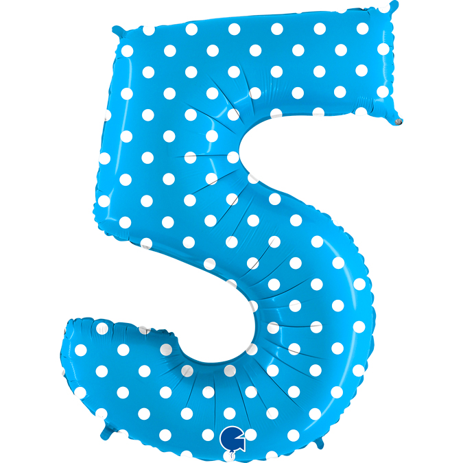Fóliový balónek číslice 5 v tyrkysové barvě s puntíky je velký 102 cm a je vhodným doplňkem výroční, novoroční i narozeninové výzdoby.