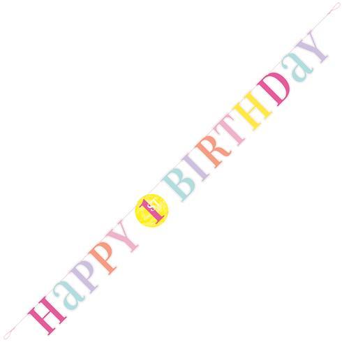 Papírová girlanda s barevným nápisem Happy 1st birthday. Zavěšuje se na šňůrkách, vhodná pro ozdobu narozeninových oslav.