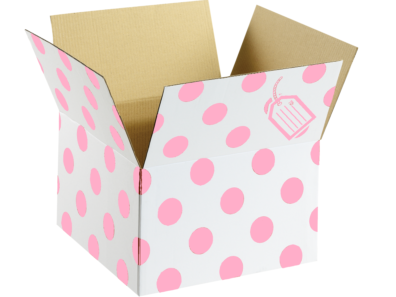 Krabice na balónky o rozměrech 38cm x 23cm x 38cm v bílé barvě s růžovými puntíky.
