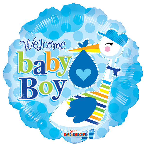 Foliový balónek ve tvaru kruhu v modré barvě s potiskem čápa a barevným nápisem "vítej chlapečku".