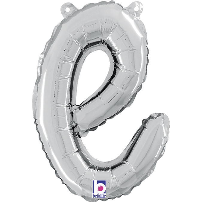 Foliový balónek ve tvaru psacího písmene E ve stříbrné barvě. Balonky jsou baleny v prodejním balení.