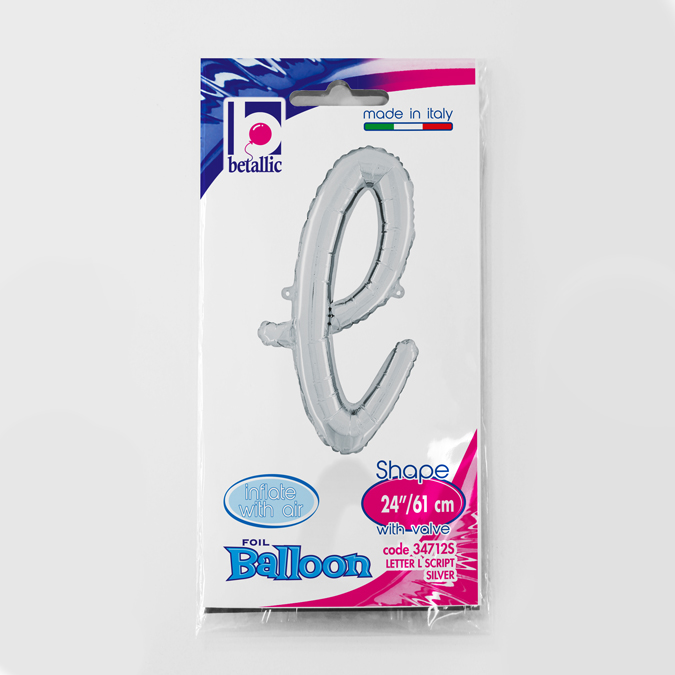 Foliový balónek ve tvaru psacího písmene L ve stříbrné barvě. Balonky jsou baleny v prodejním balení.