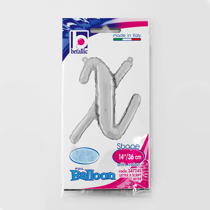 Foliový balónek ve tvaru psacího písmene X ve stříbrné barvě. Balonky jsou baleny v prodejním balení.