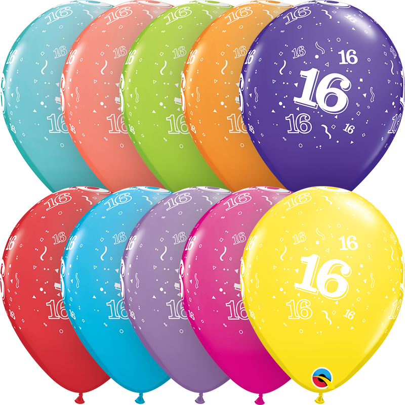 6ks pastelových narozeninových balónků v mixu barev s potiskem číslice 16 o průměru 28cm.