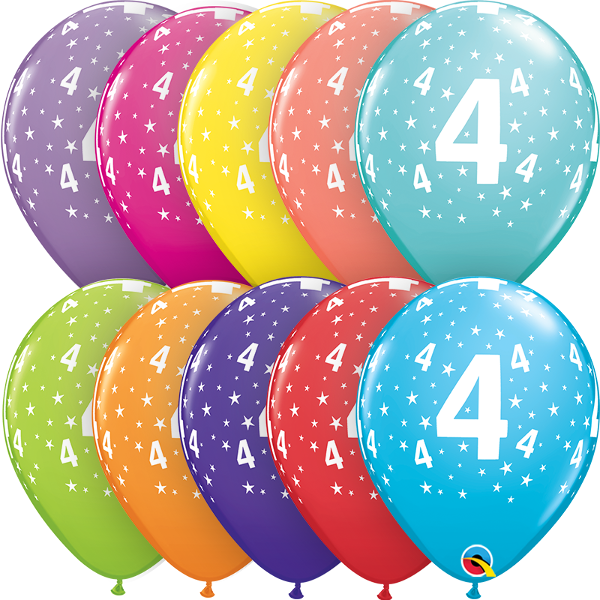 6ks pastelových narozeninových balónků v mixu barev s potiskem číslice 4 o průměru 28cm.