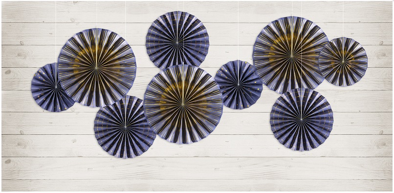 Dekorační rozety v královsky modré barvě s potiskem zlatých motivů.